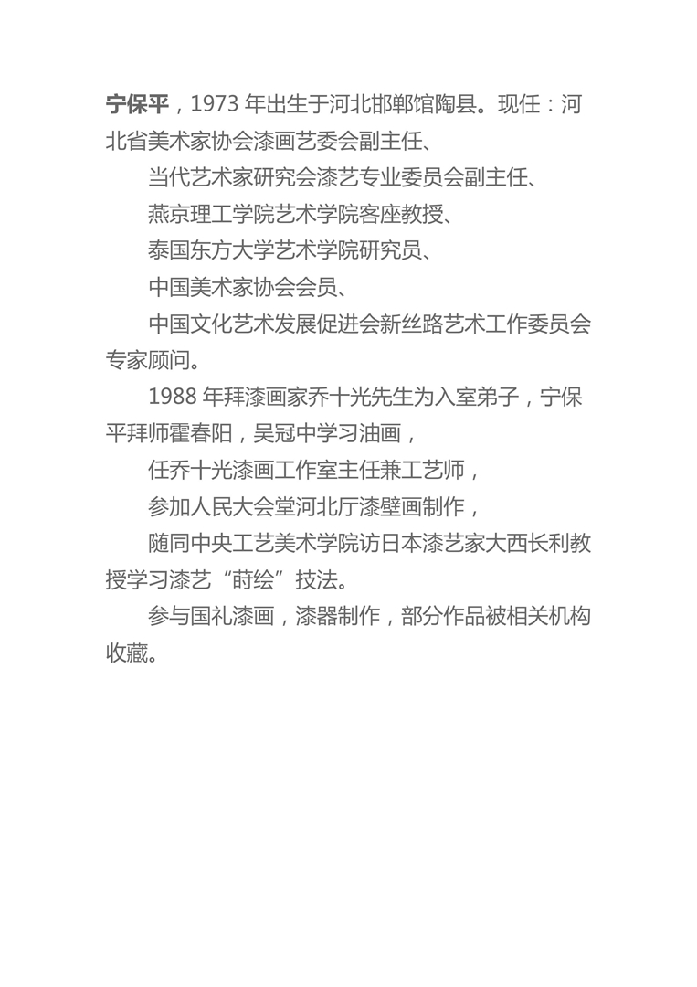 宁保平,1973年,出生于河北邯郸馆陶县,1988年,随著名漆画家乔十光教授学习,1994年 参加人民大会堂河北厅漆壁画制作,同年于中央工艺美学院随日本漆艺家大西长利教授学习漆艺“莳绘”技法,1996年 漆器作品《五子连体脱胎漆盘》参加“96•中韩漆艺交流北京展”在中国美术馆展出;同年编入《中国现代美术全集•漆器卷》。